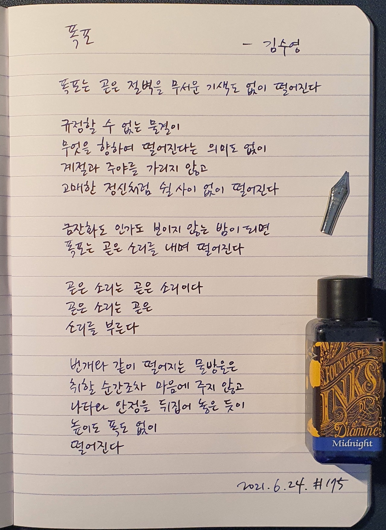 #폭포 #김수영 #닙펜 #딥펜 #펜글씨 #손글씨 #매일시쓰기 #1일1시 #하루에시한편 #이른아침을먹던여름 #thatsummerwithyou