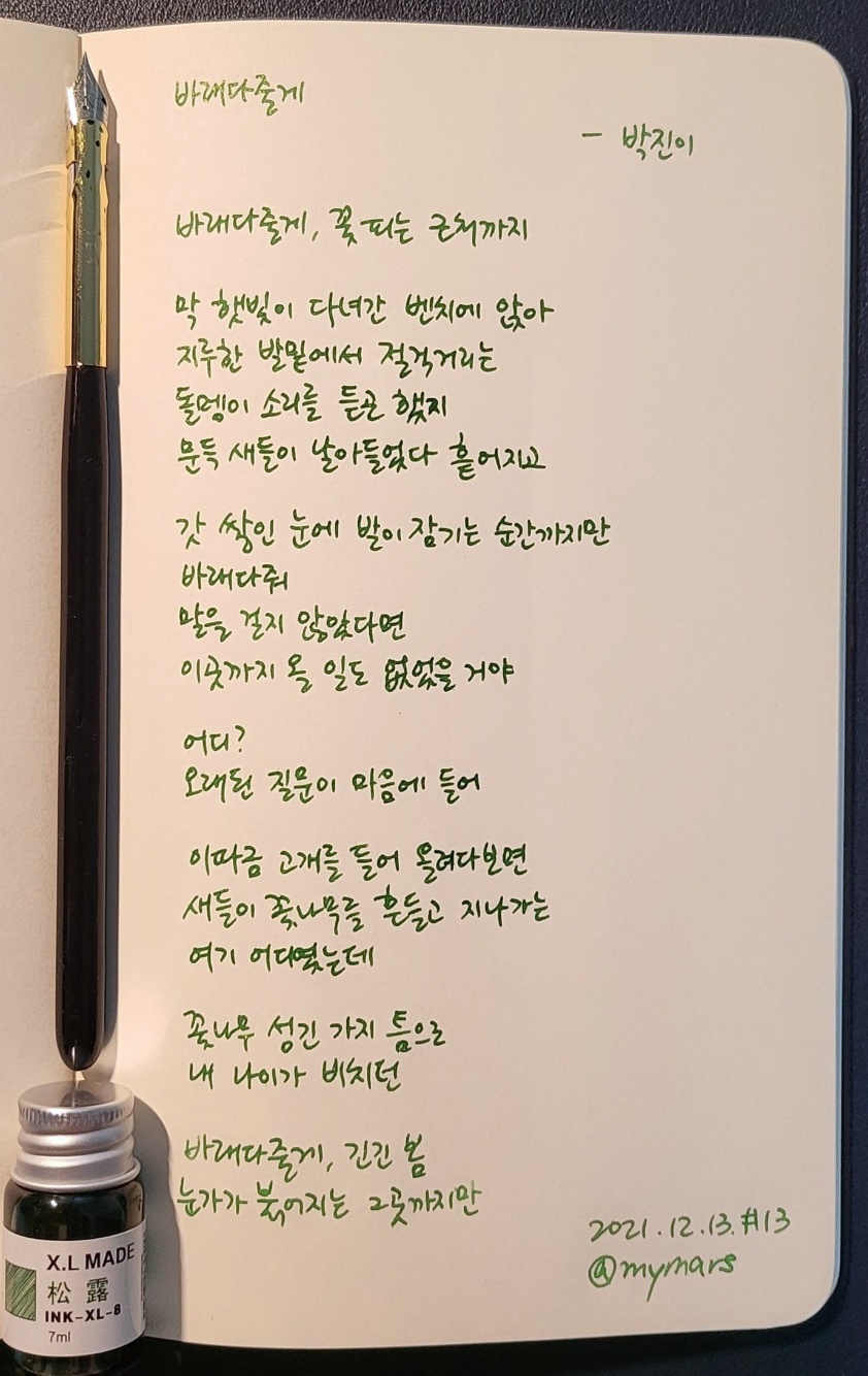 #바래다줄게 #박진이 #신발을멀리덜지면누구나길을잃겠지 #너에게들려주는시 #poetrytoyou #시 #시낭독 #시낭송 #낭독일기 #시필사 #손글씨 #닙펜 #딥펜 #펜글씨 #매일시쓰기 #1일1시 #하루시한편 #매일프로젝트 #유캔두 #일단백챌린지 #카카오임펙트 #프로젝트100 #마이마르스 #mymars #나의화성