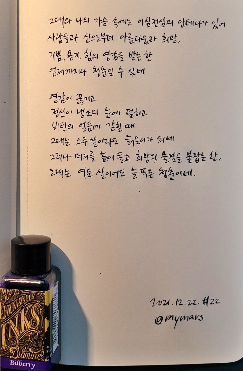 #청춘 #사무엘울만 #Youth #너에게들려주는시 #poetrytoyou #시 #시낭독 #시낭송 #낭독일기 #시필사 #손글씨 #닙펜 #딥펜 #펜글씨 #매일시쓰기 #1일1시 #하루시한편 #매일프로젝트 #유캔두 #일단백챌린지 #카카오임펙트 #프로젝트100 #마이마르스 #mymars #나의화성