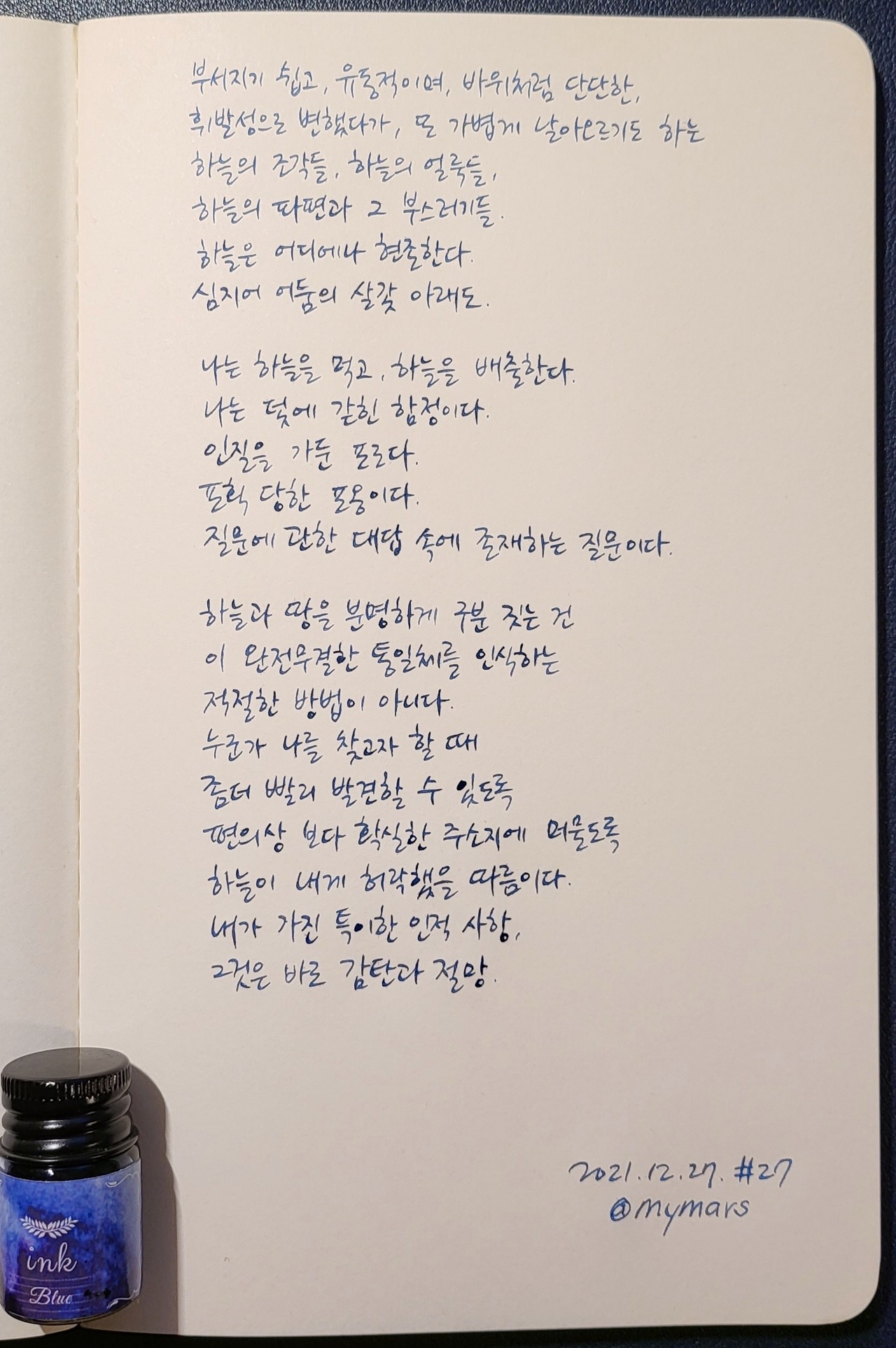 #하늘 #비스와바쉼보르스카 #끝과시작 #너에게들려주는시 #poetrytoyou #시 #시낭독 #시낭송 #낭독일기 #시필사 #손글씨 #닙펜 #딥펜 #펜글씨 #마이마르스 #mymars #나의화성