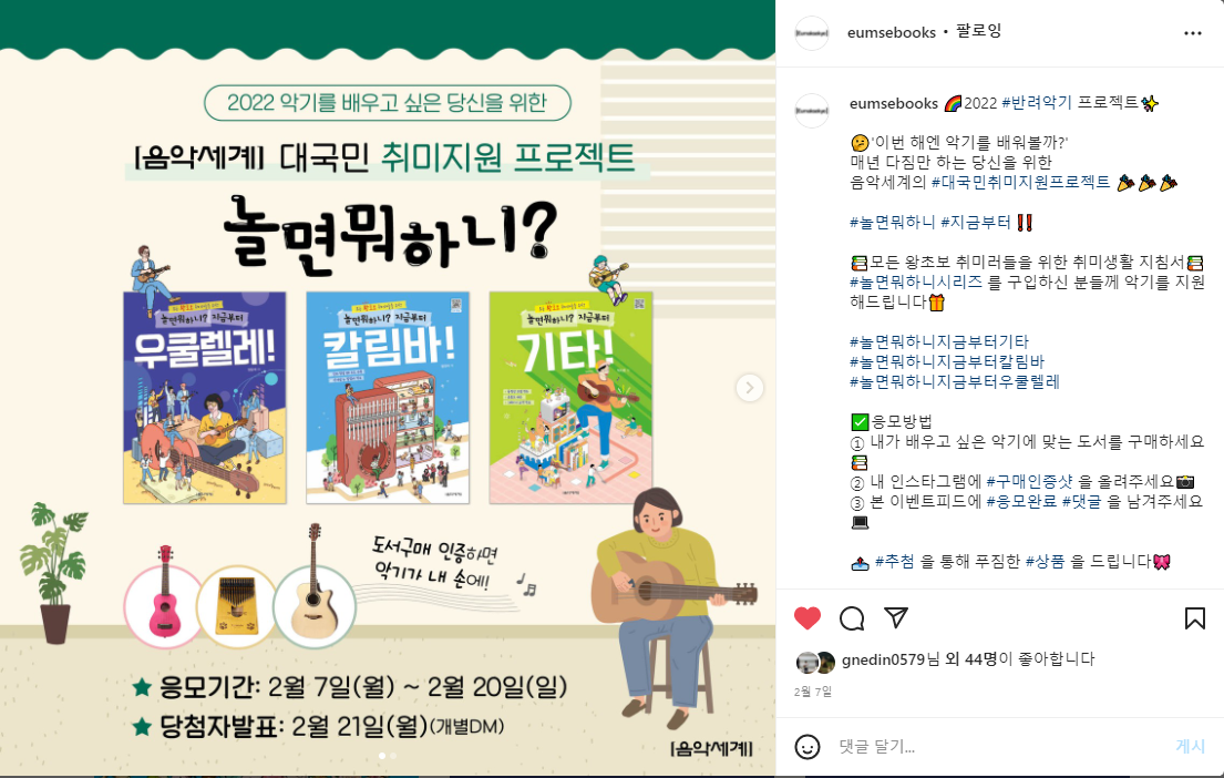구매인증샷을 올리고 음악세계 인스타를 통해 응모하면 통기타 경품도 있대요~
