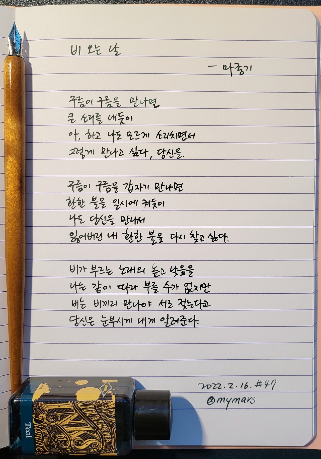 #비오는날 #마종기 #그나라하늘빛 #너에게들려주는시 #poetrytoyou #시 #시낭독 #시낭송 #낭독일기 #시필사 #손글씨 #닙펜 #딥펜 #펜글씨 #마이마르스 #mymars #나의화성