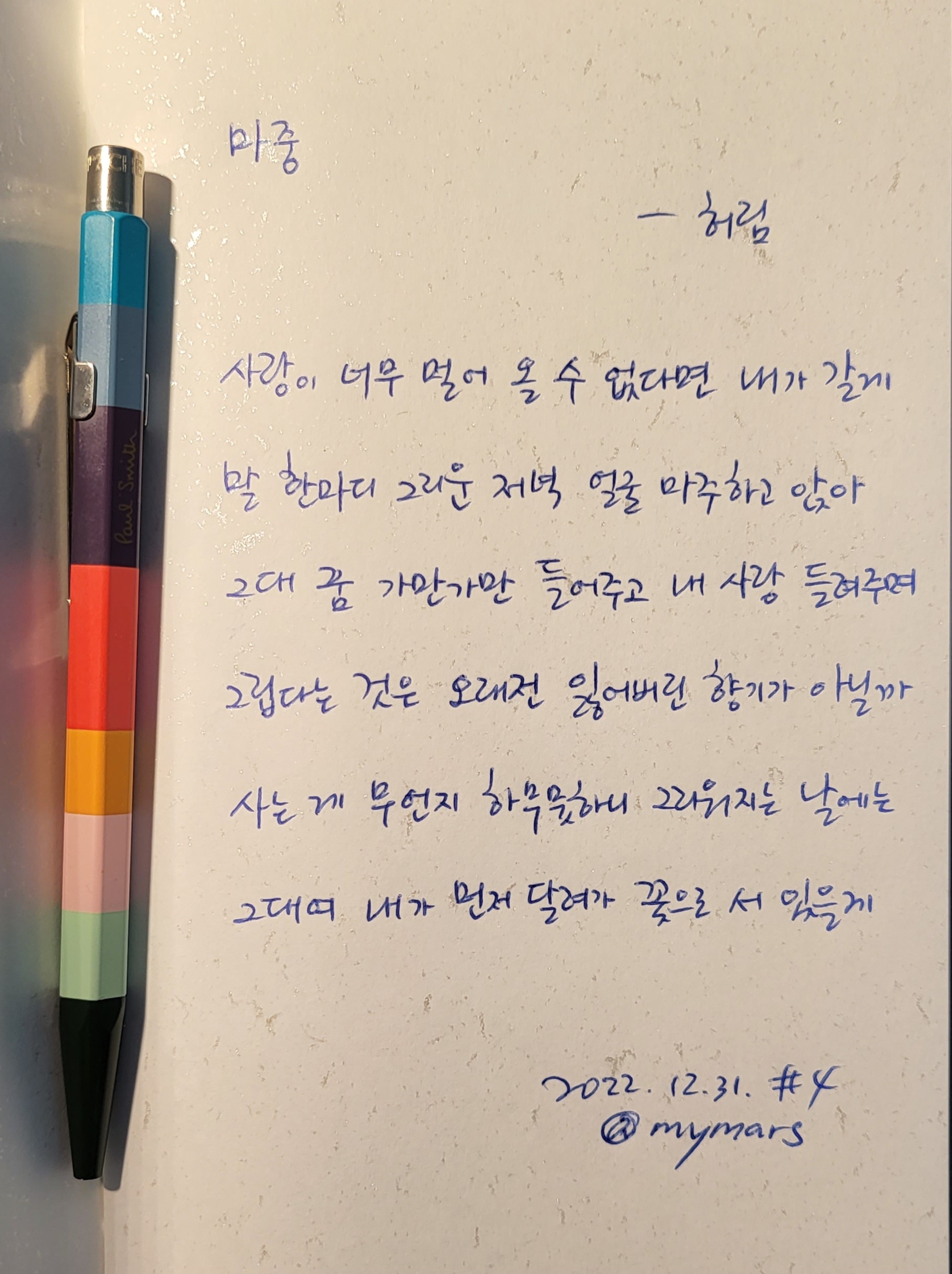 #마중 #허림 #보내지않았는데벌써갔네 #너에게들려주는시 #poetrytoyou #시 #시낭독 #시낭송 #낭독일기 #시필사 #손글씨 #볼펜 #까렌다쉬 #CARANDACHE #PaulSmith #마이마르스 #mymars #나의화성 #ballpointpen