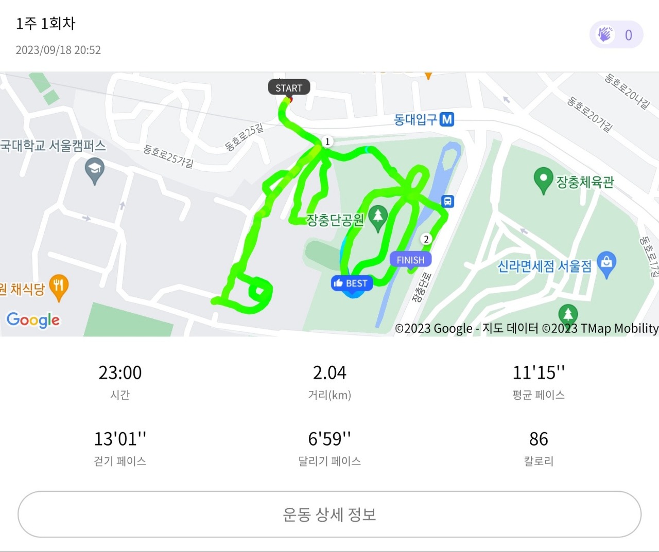 야심 차게 중문으로 들어갔으나 운동장은커녕 가도 가도 끝없는 언덕과 계단과 건물만 있어서 그냥 장충단 공원으로 내려가서 마무리하고 왔다.