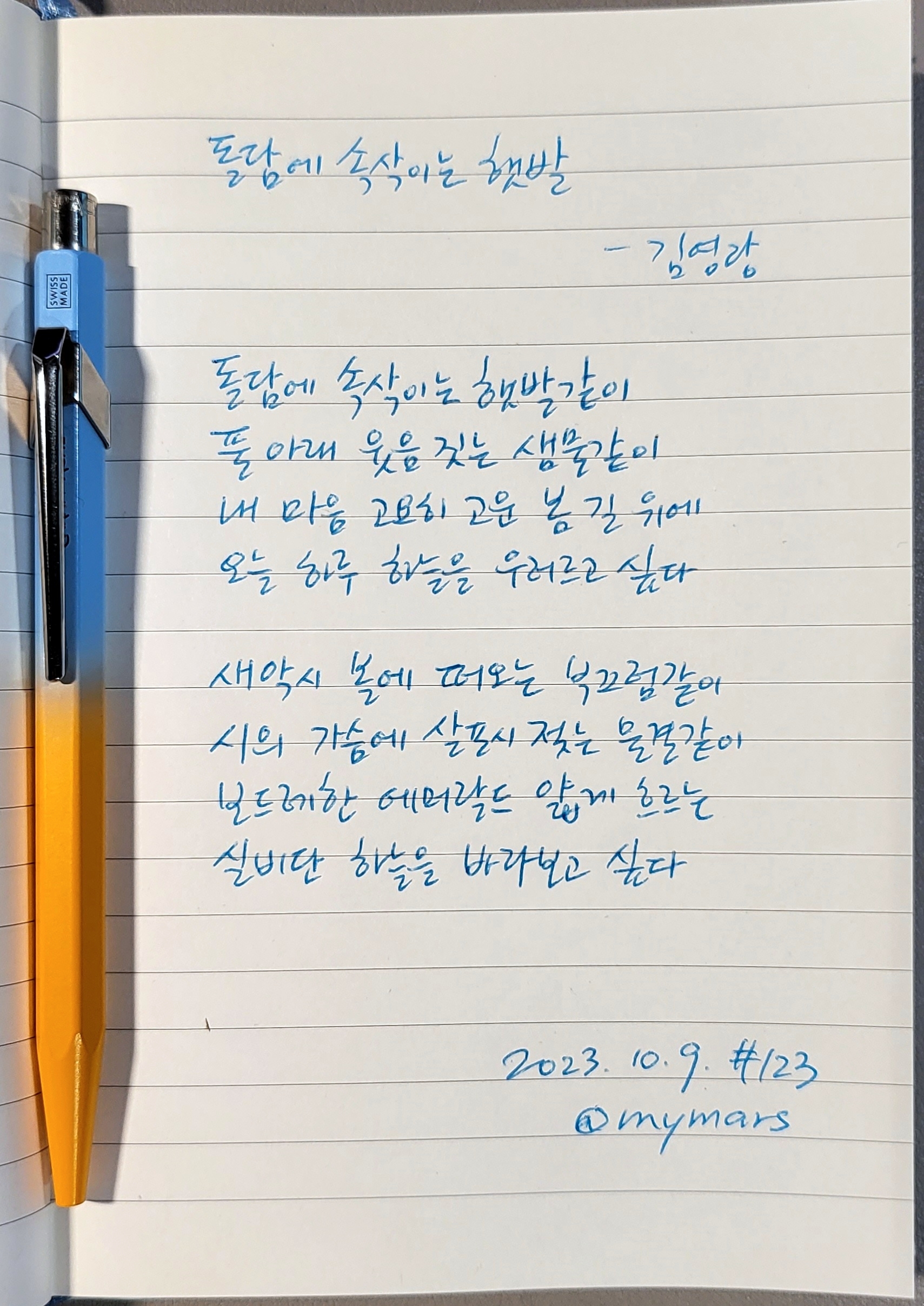 #돌담에속삭이는햇발 #김영랑 #영랑시집 #너에게들려주는시 #poetrytoyou #시 #시낭독 #시낭송 #낭독일기 #시필사 #손글씨 #볼펜 #까렌다쉬 #CARANDACHE #펜글씨 #마이마르스 #mymars #나의화성 #한글날