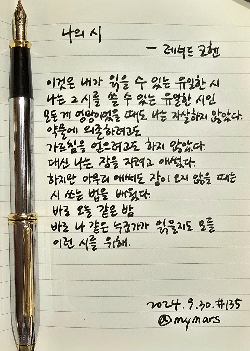 #나의시 #레너드코헨 #사랑하라한번도상처받지않은것처럼 #너에게들려주는시 #poetrytoyou #시 #시낭독 #시낭송 #낭독일기 #시필사 #손글씨 #펜글씨 #만년필 #마이마르스 #나의화성 #mymars