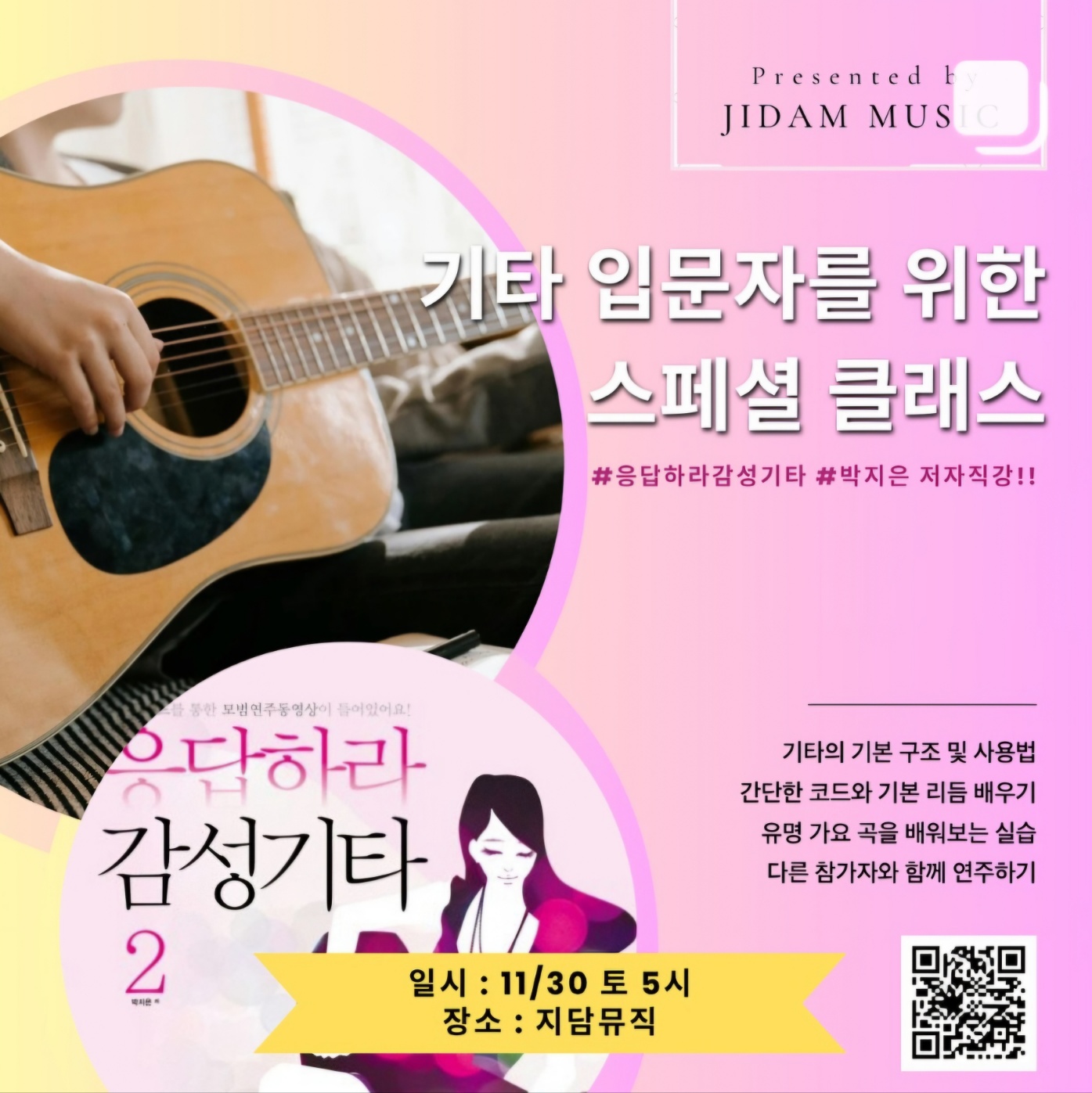 #기타입문 #기타수업 #취미기타 #쉬운기타 #기타강좌 #통기타배우기 #어쿠스틱기타 #왕초보기타 #지담뮤직 #음악워크숍 #원데이클래스 #음악교육 #음악과감성 #박지은강사 #저자직강 #응답하라감성기타 #놀면뭐하니지금부터기타 #음악세계