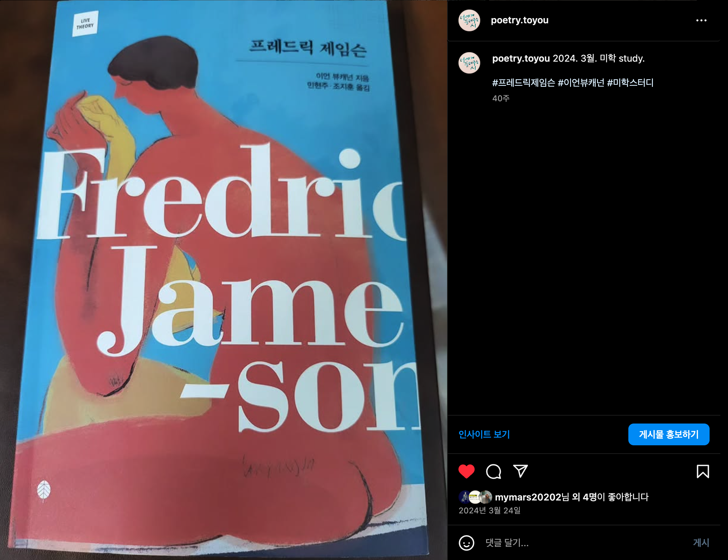 인문학 공부/미학 스터디 프레드릭 제임슨 1 박지은(MyMars) 2025. 1. 1. 00:15 https://www.instagram.com/p/C4411HaR-Ip/ 2024. 3월. 미학 study. 20240324 #프레드릭제임슨 #이언뷰캐넌 #미학스터디 반응형 저작자표시 비영리 변경금지 (새창열림)