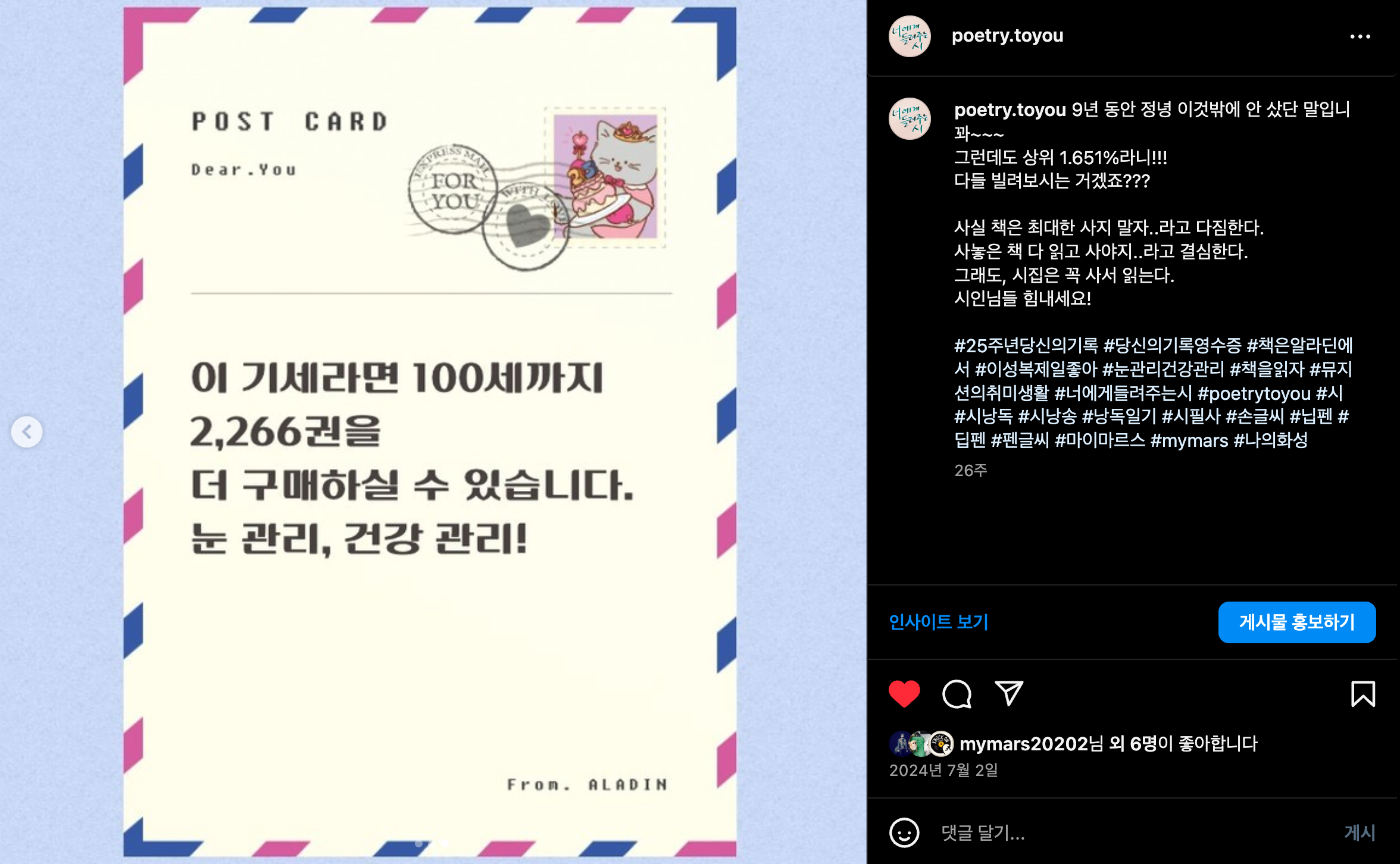 #25주년당신의기록 #당신의기록영수증 #책은알라딘에서 #이성복제일좋아 #눈관리건강관리 #책을읽자 #뮤지션의취미생활 #너에게들려주는시 #poetrytoyou #시 #시낭독 #시낭송 #낭독일기 #시필사 #손글씨 #닙펜 #딥펜 #펜글씨 #마이마르스 #mymars #나의화성