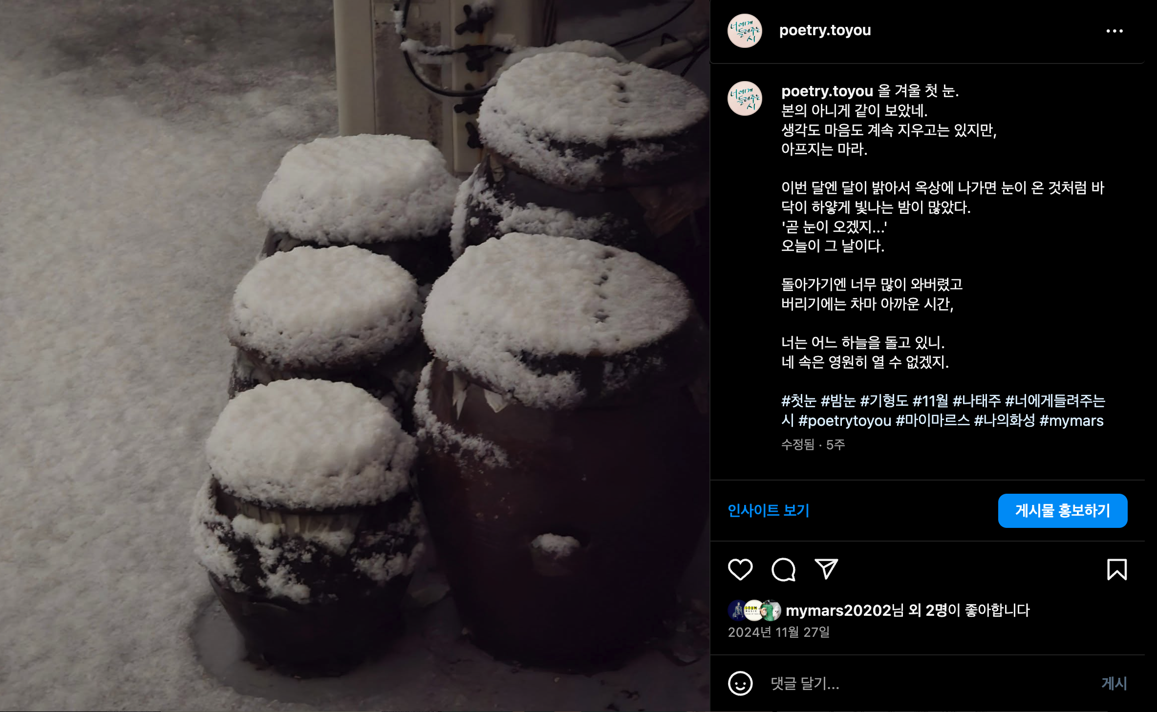 #첫눈 #밤눈 #기형도 #11월 #나태주 #너에게들려주는시 #poetrytoyou #마이마르스 #나의화성 #mymars