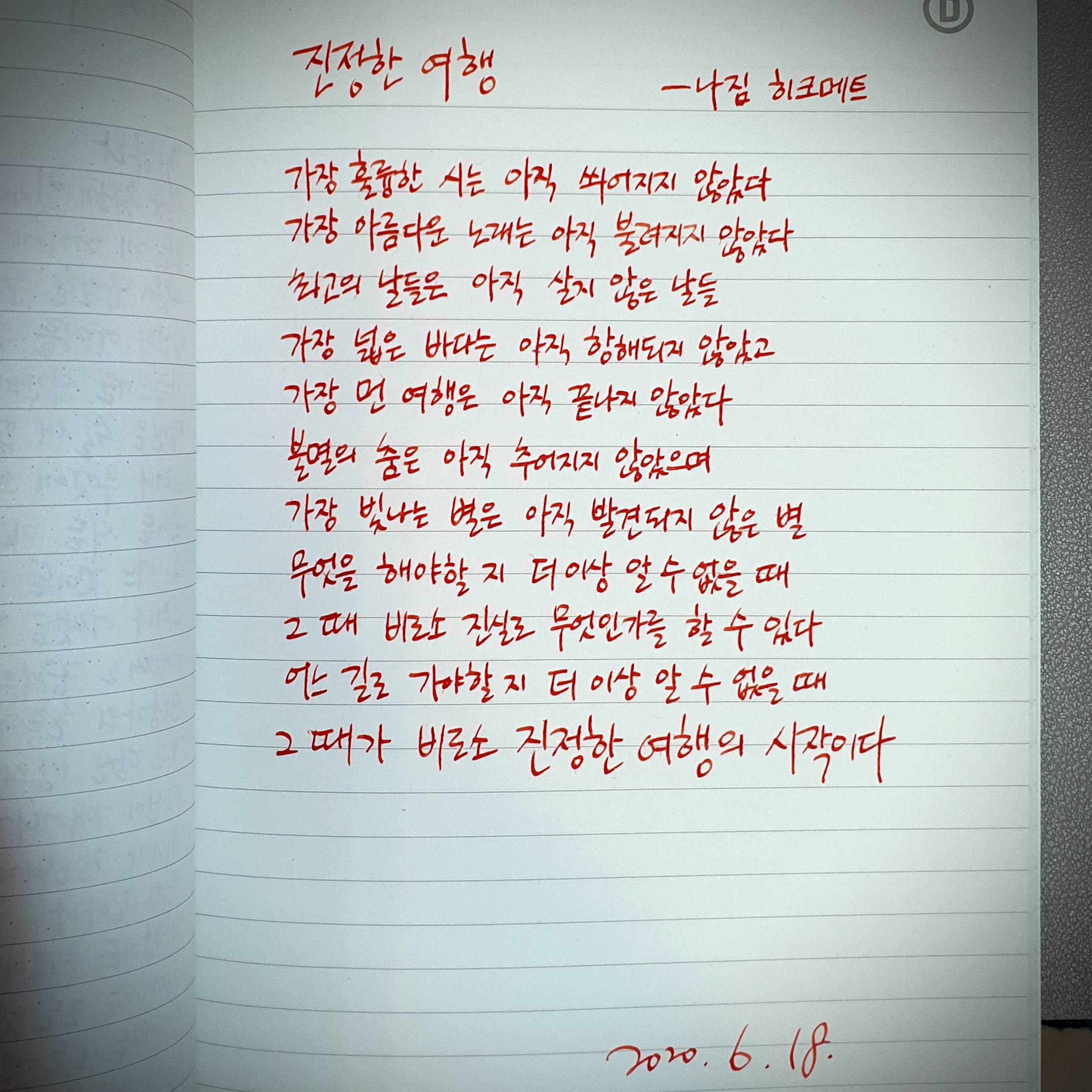 #진정한여행 #나짐히크메트 #시필사 #펜글씨 #손글씨 #닙펜 #딥펜 #골드펄잉크 #매일프로젝트 #이른아침을먹던여름 #thatsummerwithyou
