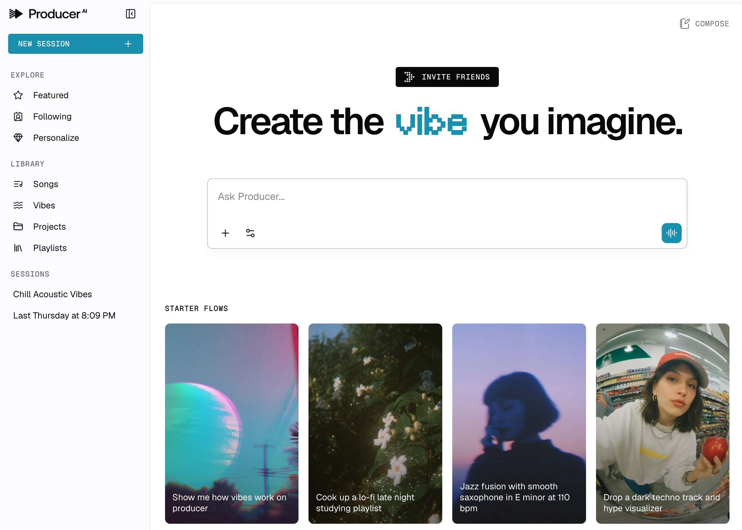 Producer.ai는 사용자가 여러 단계의 프롬프트를 조합하고 저장하여 나만의 음악 생성 명령을 만들 수 있는 'Starter Flows'라는 기능을 선보였다.
