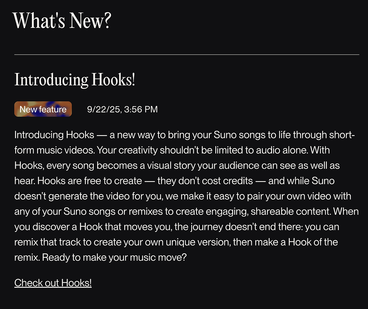 Hooks는 사용자가 자신의 Suno 음원과 영상 클립을 결합해 짧은 형태의 시각적 콘텐츠(뮤직 숏폼)를 만들 수 있게 한다는 기능이다.