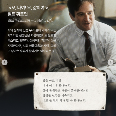 "월트 휘트먼은 말했지. '오, 나여! 오, 삶이여! 끊임없이 반복되는 질문들, 믿음 없는 자들의 끝없는 행렬, 어리석은 자들로 가득 찬 도시들... 이 사이에서 무슨 희망을 찾을 수 있을까, 오 나여, 오 삶이여?' 답은 이것이다. 네가 여기에 있다는 것. 삶이 존재하고 기록된다는 것. 화려한 연극은 계속되고, 네가 시 한 줄을 보탤 수 있다는 것. 너의 구절은 무엇이 될 것인가?"
