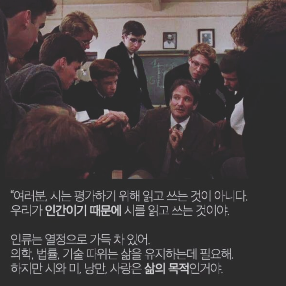 "우리가 시를 읽고 쓰는 이유는 그것이 단지 예쁘장하기 때문이 아니다. 우리가 인류의 일원이기 때문에 시를 읽고 쓰는 것이다. 인류는 열정으로 가득 차 있다. 의학, 법률, 경영, 공학은 고귀한 학문이며 삶을 유지하기 위해 필요한 것들이다. 하지만 시, 아름다움, 낭만, 사랑은 우리가 살아있기 위해 존재하는 것들이다."
