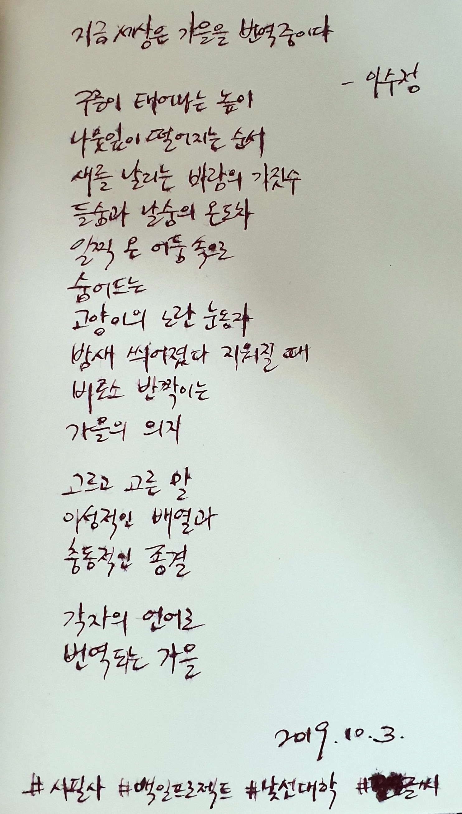 #지금세상은가을을번역중이다 #이수정 #시필사 #손글씨 #펜글씨 #닙펜 #딥펜 #백일프로젝트 #카카오프로젝트100 #낯선대학