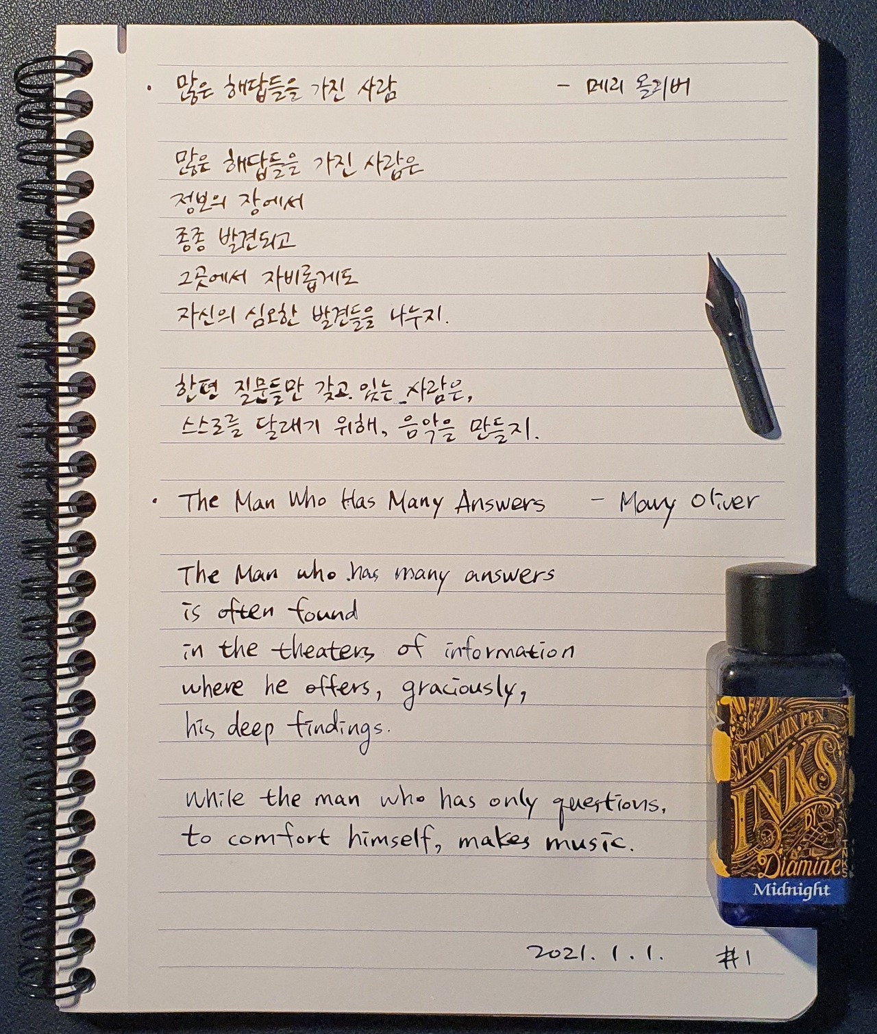 #많은해답들을가진사람 #메리올리버 #TheManWhoHasManyAnswers #MaryOliver #시필사 #닙펜 #딥펜 #펜글씨 #손글씨 #매일시쓰기 #1일1시 #하루에시한편 #이른아침을먹던여름 #thatsummerwithyou #2021시작