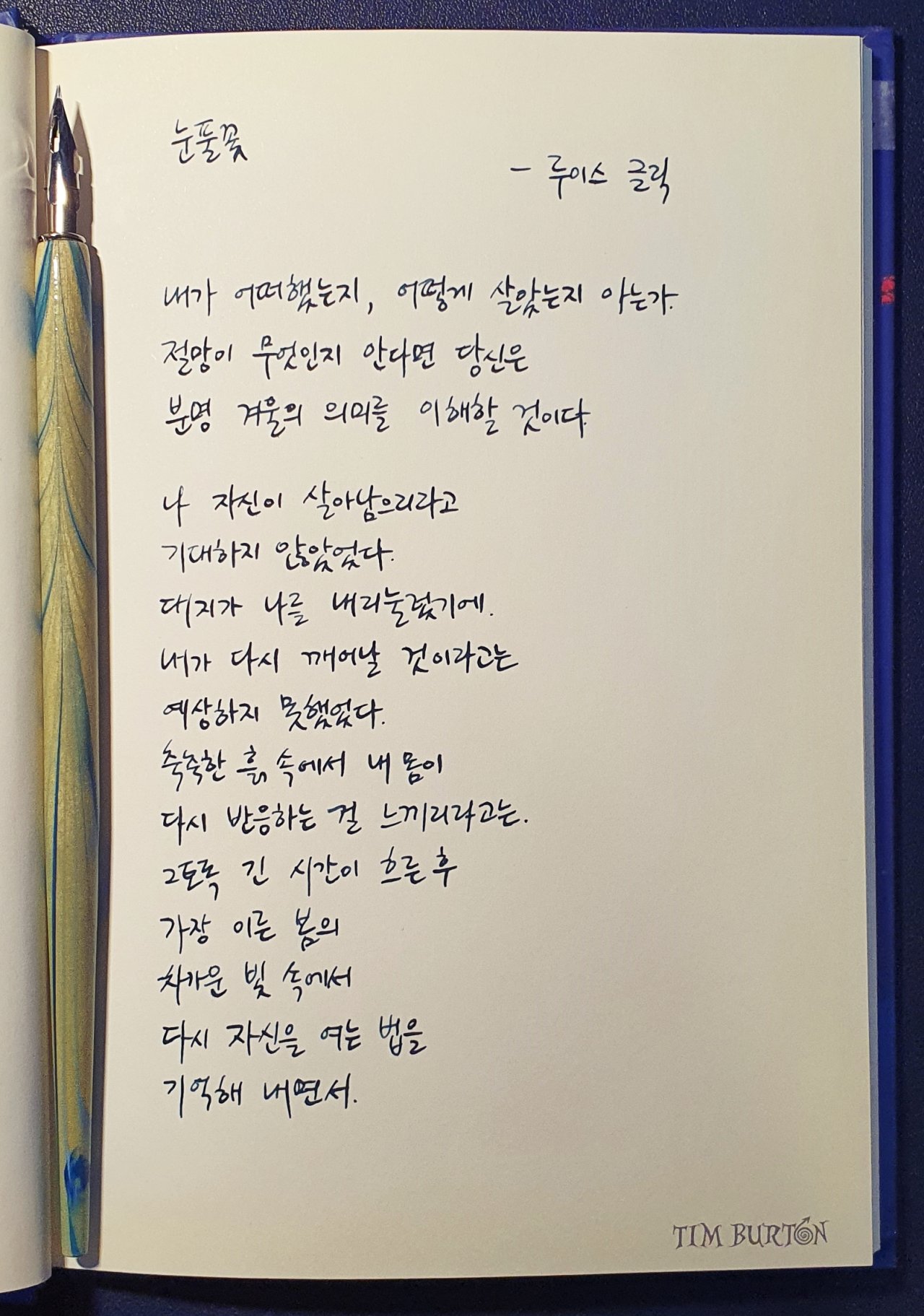 #눈풀꽃 #루이스글릭 #2020년노벨문학상 #닙펜 #딥펜 #펜글씨 #손글씨 #매일프로젝트 #이른아침을먹던여름 #thatsummerwithyou #카카오프로젝트100 #낯선대학 #시처럼시필사