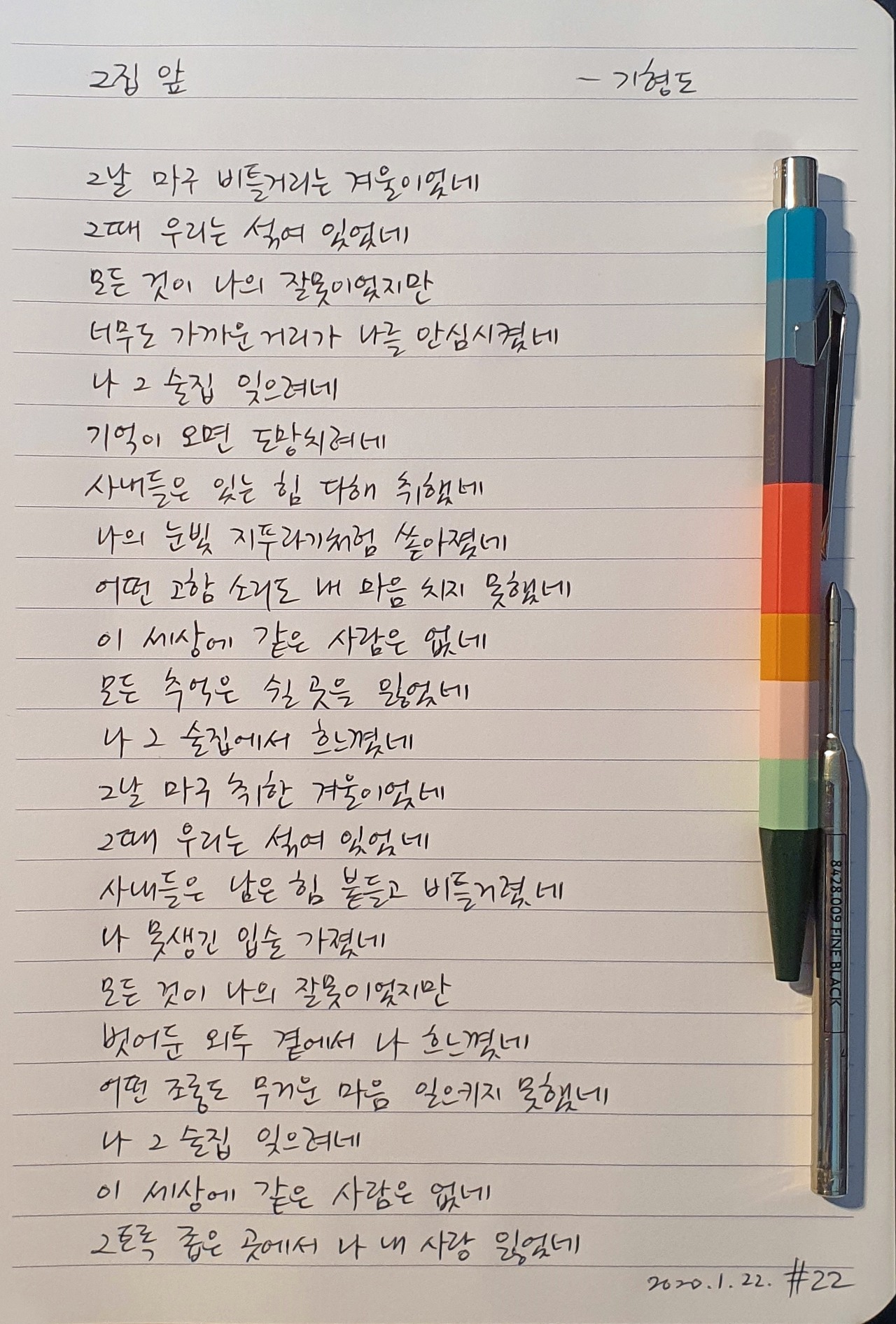 #그집앞 #기형도 #시필사 #볼펜 #까렌다쉬 #CaranDache #폴스미스 #PaulSmith #손글씨 #매일시쓰기 #1일1시 #하루에시한편 #이른아침을먹던여름 #thatsummerwithyou #나의화성 #MyMars