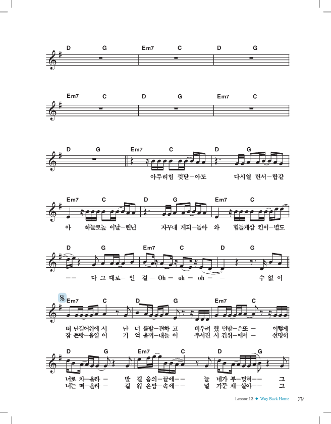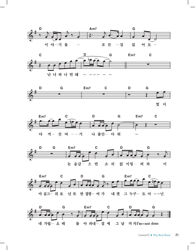 80 페이지 마지막 줄부터 81 페이지 두 번째 줄까지는 코드를 한마디에 1번(4박자) 바꾸니까 이 부분만 주의해주세요.