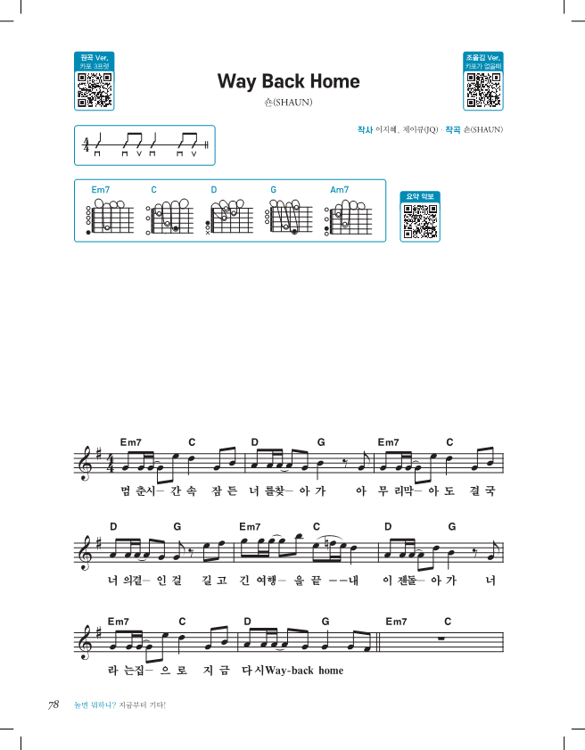 오늘은 숀(SHAUN)의 'Way Back Home'을 처음부터 끝까지 쭈욱, 천천히 쳐보겠습니다.
