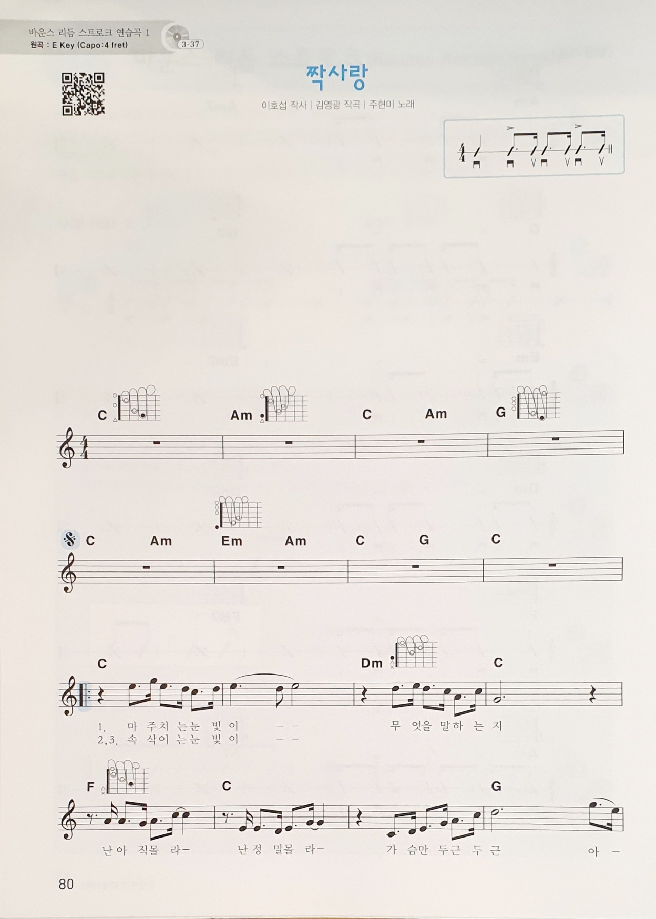 잘되시는 분들은 '응답하라 감성기타 1'에 있는 '짝사랑'(P.76~77)를 연습해봅시다.
