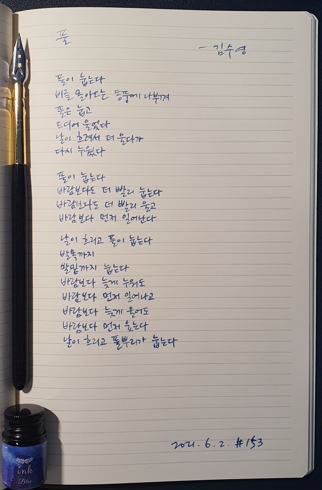 #풀 #김수영 #시필사 #닙펜 #딥펜 #펜글씨 #손글씨 #매일시쓰기 #1일1시 #하루에시한편 #이른아침을먹던여름 #thatsummerwithyou